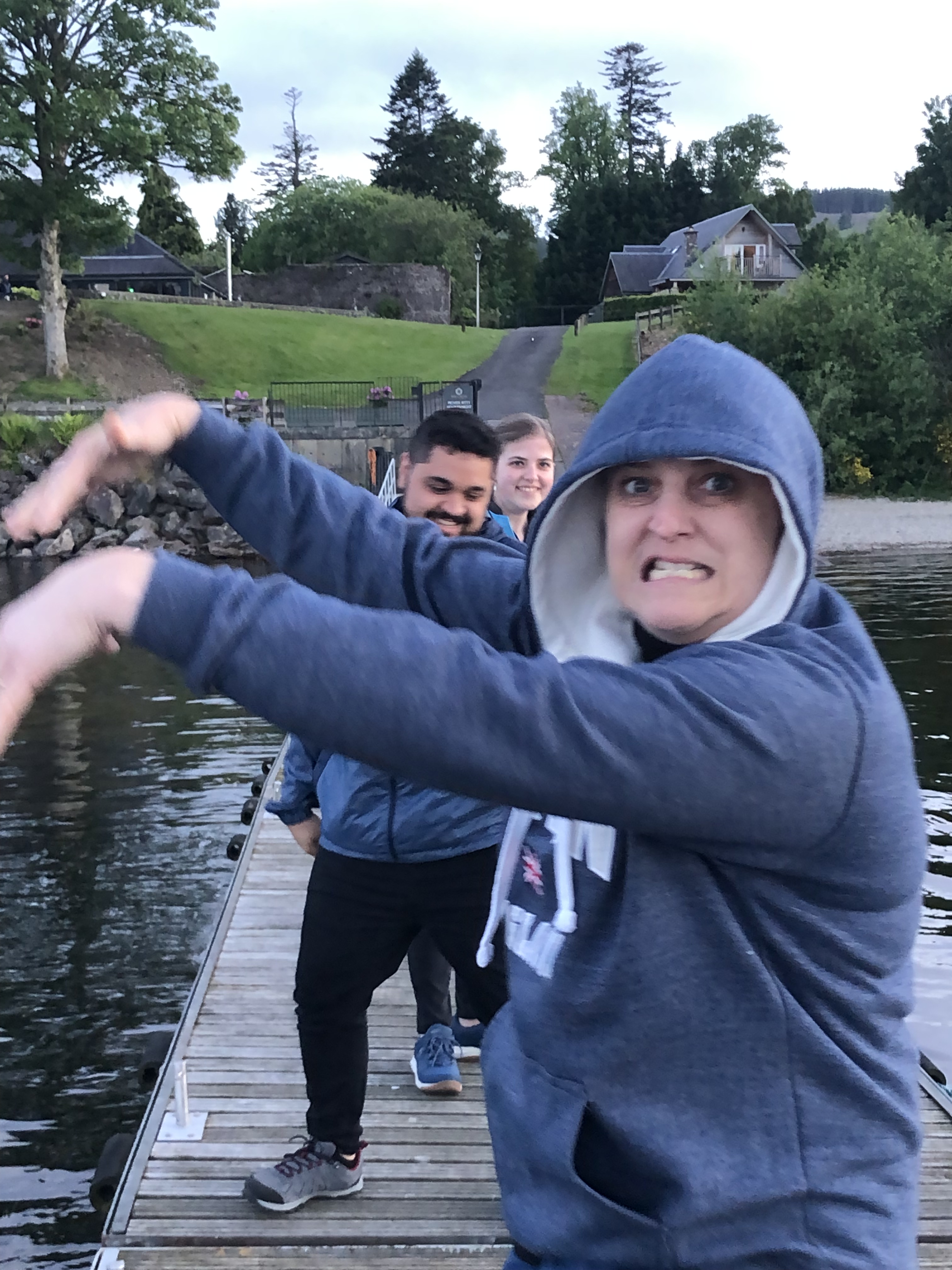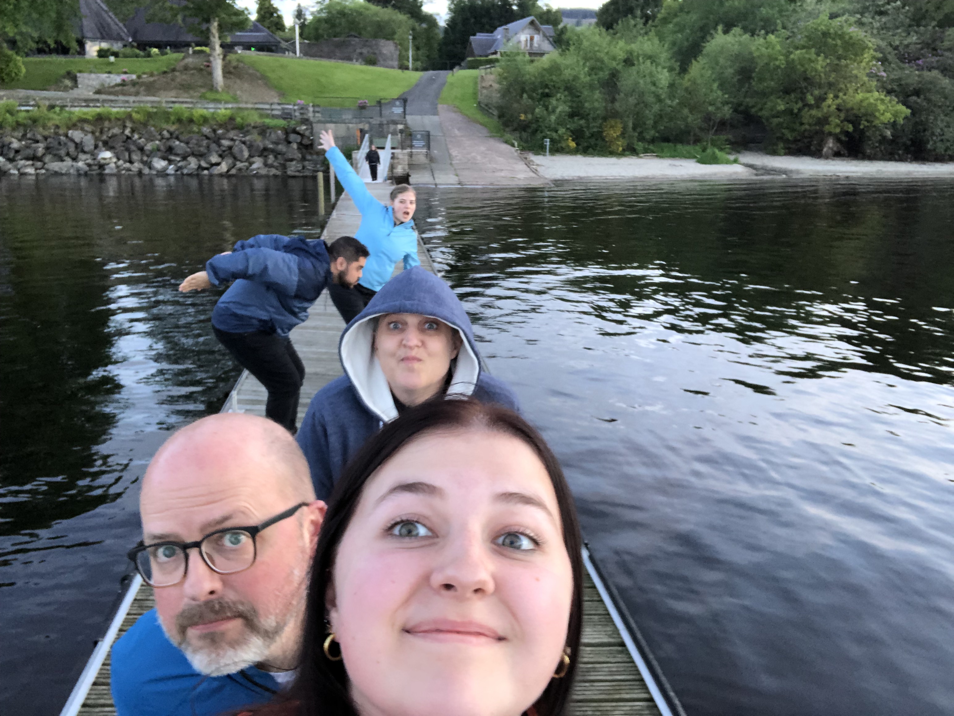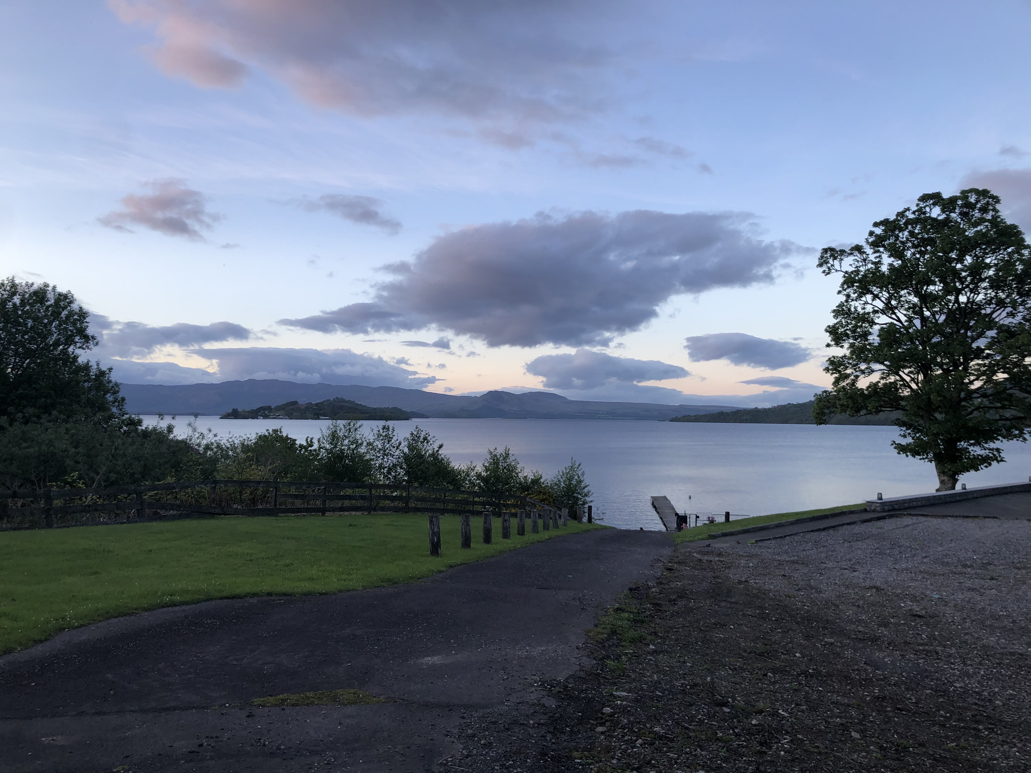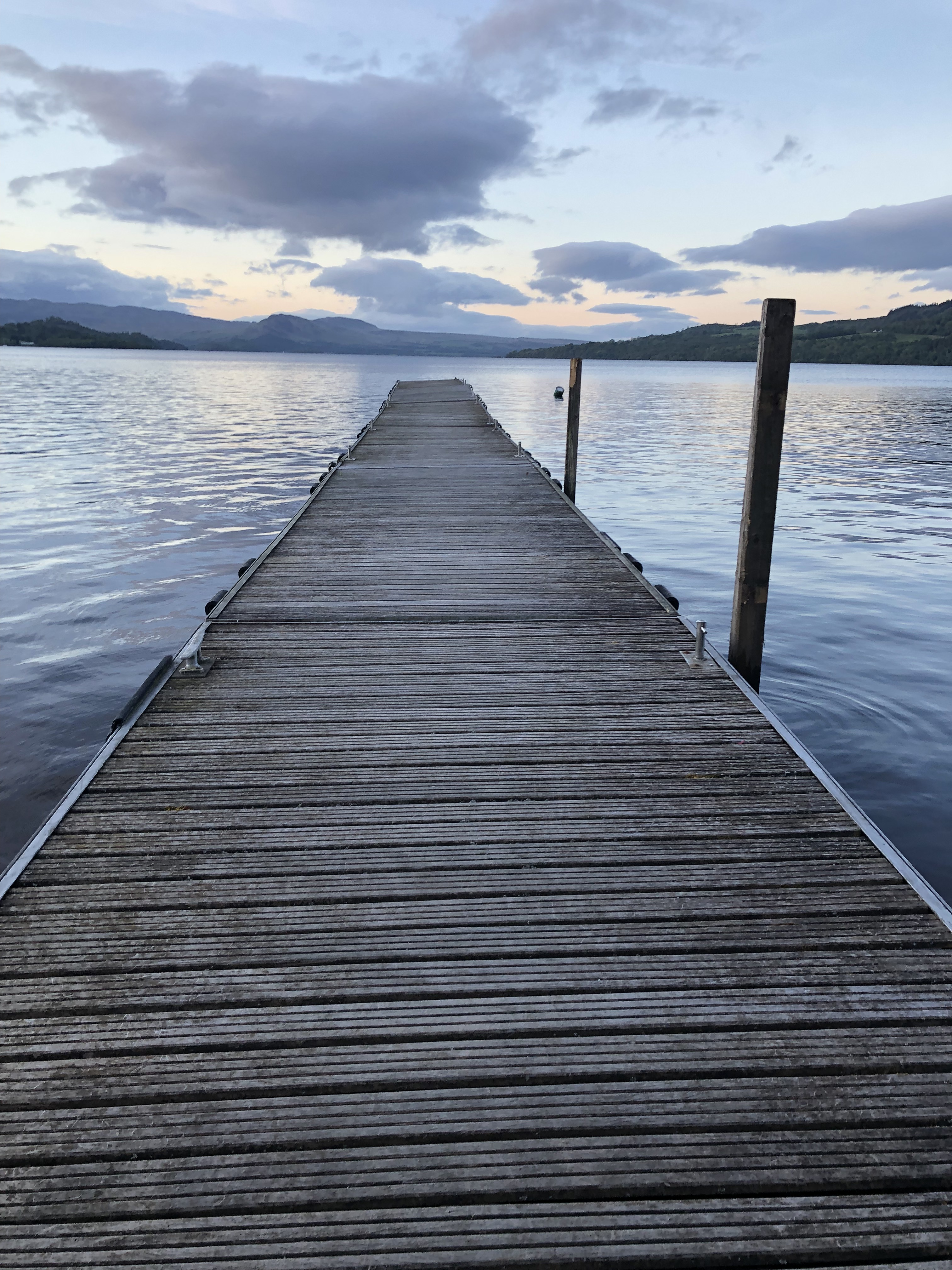 A brief comment here on our position: we forgot until arriving just how far north Scotland really is. For reference, it is on the same latitudinal line (56 degrees N) as Newfoundland, Moscow, and Copenhagen. The sky remains light until nine or ten PM every night, with a prolonged twilight that feels very magical. The temperatures stayed in the cool fifties and sixties, and that first night, after a pasta dinner, we strolled on down to the dock connected to our Airbnb property and just stared out at Loch Lomond. But of course, goofiness ensued. And after, some more Wheel of Time :).