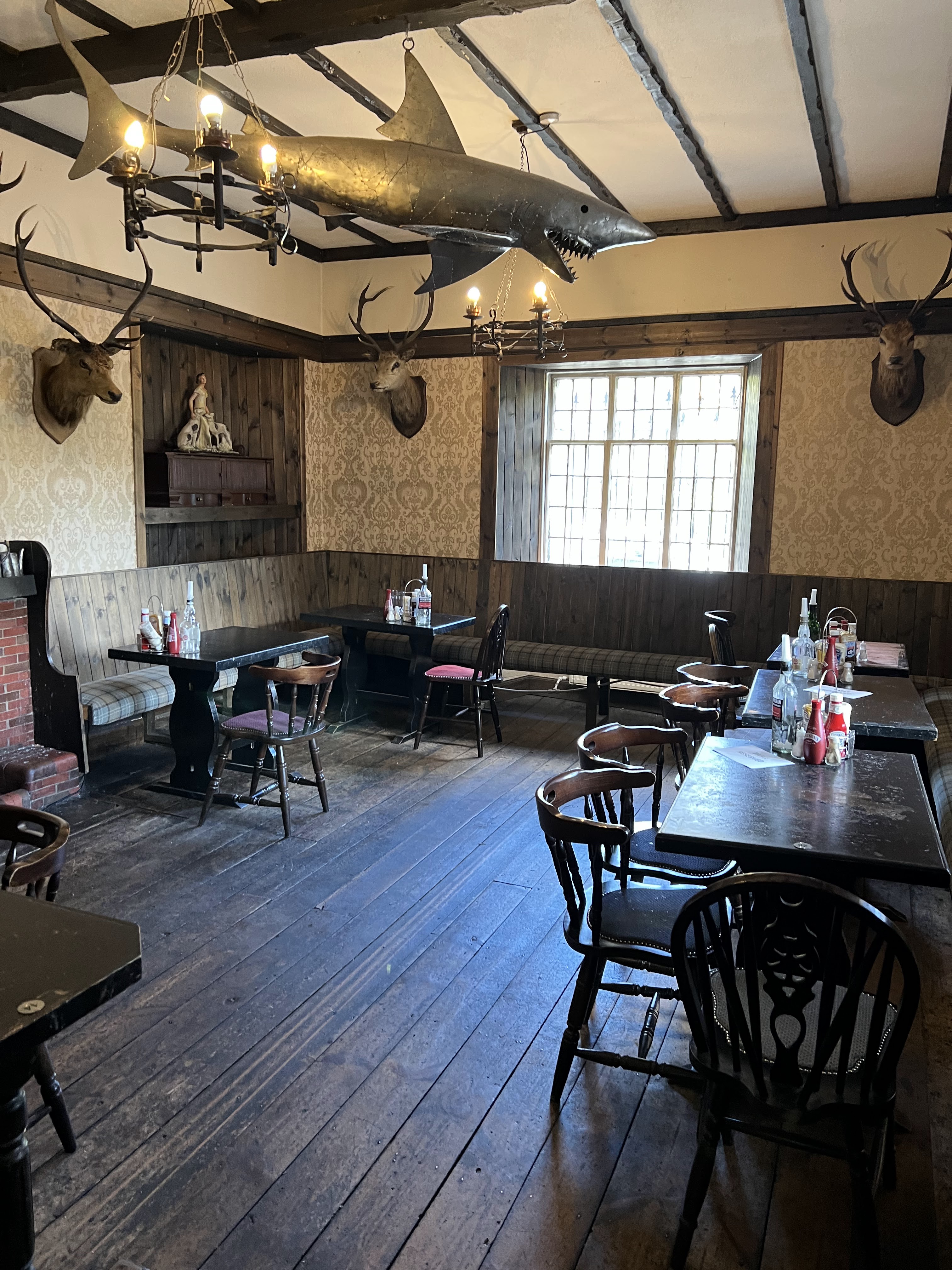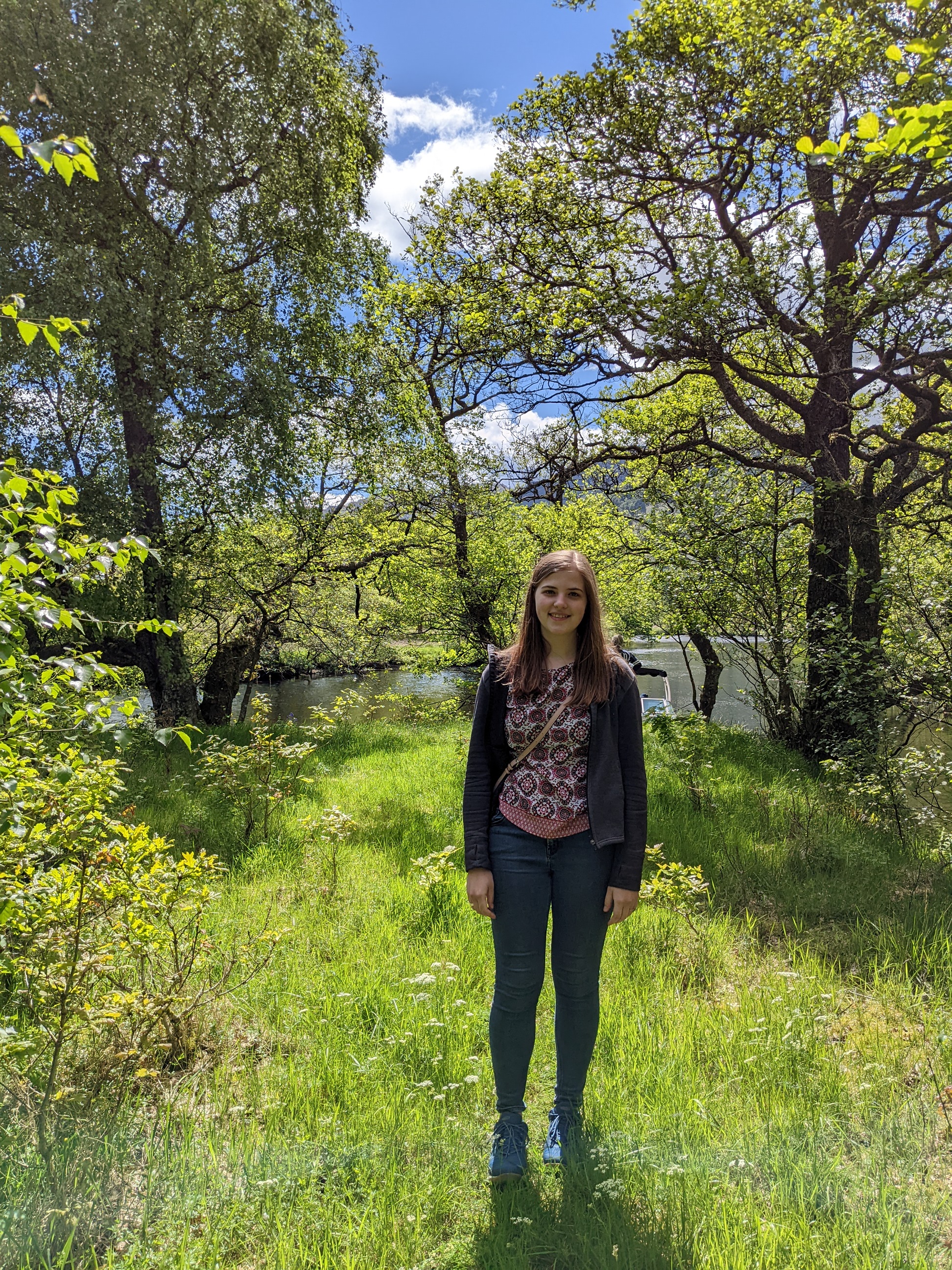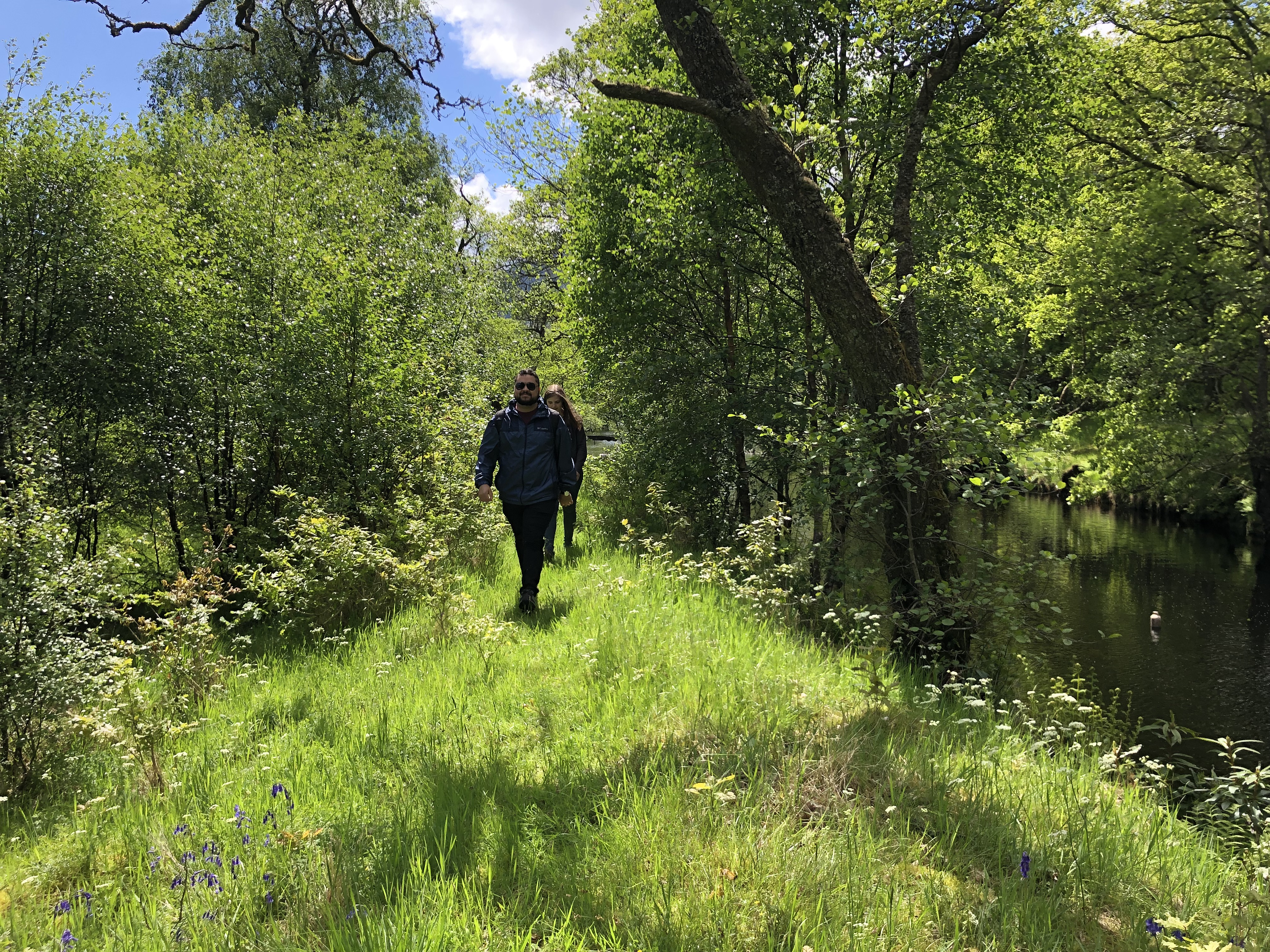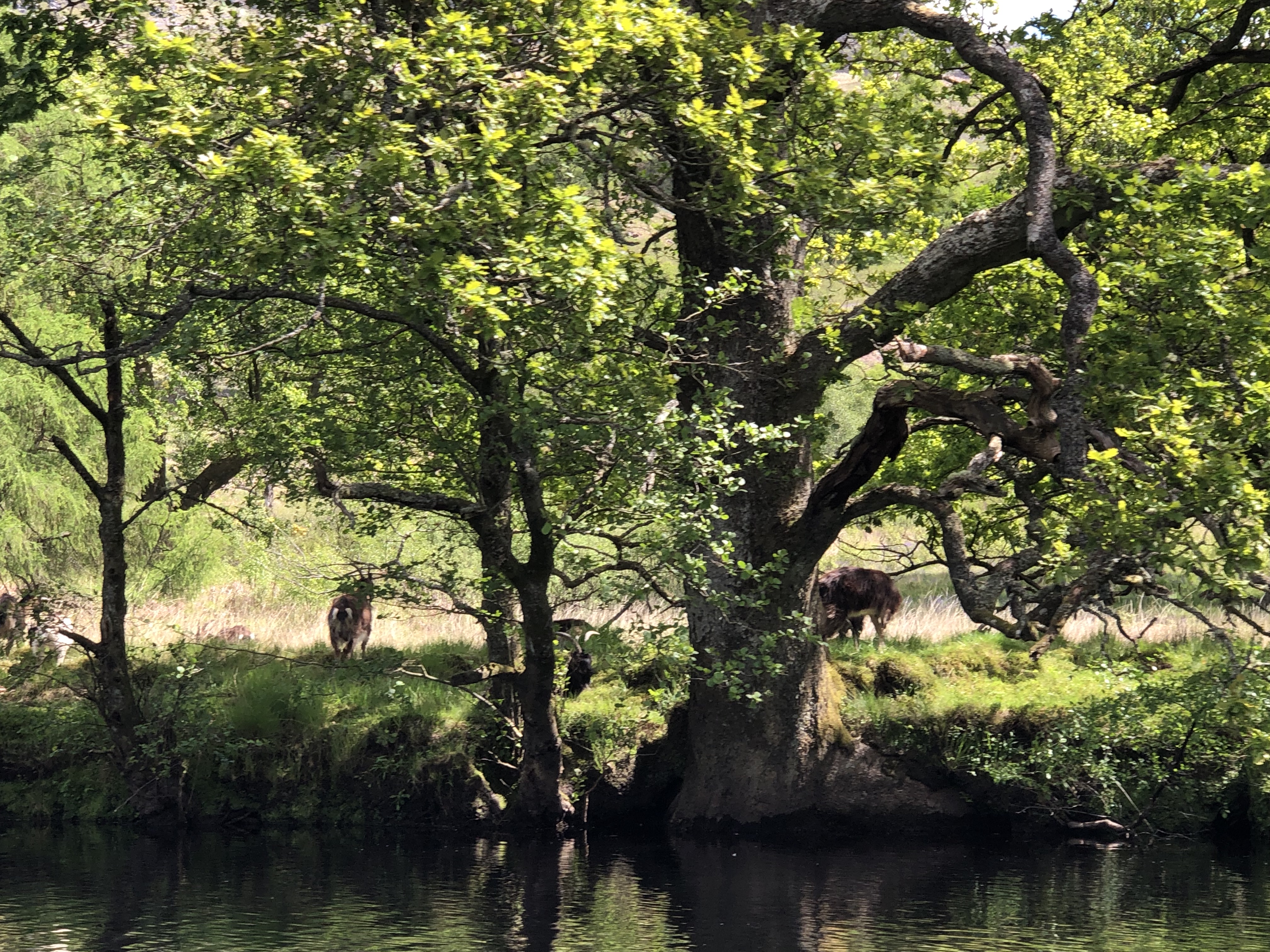 A row of islands marks the beginning of the Scottish Highlands (at the Highland Boundary Fault), and we could see the landscape around us shift from rolling hills into steep cliffs and peaks. He pointed out Ben Lomond, a mountain that attracts mountaineers and hikers every year to scale the summit (also starred). We got a little nervous when the river just… ended, but Chris wasted no time jumping out into a little clearing, tying the boat to a tree, and leading us through a field we thought might mark the beginning of the next Midsommar movie. Never fear! he said, and we soon arrived at the oldest pub, the Drovers Inn, in the loch region. A treat! Haggis burgers, fish and chips, and beer for lunch! We were sated and only a little gassy. On the way back, we stopped at one of the islands to poke around and get another view of the lake.