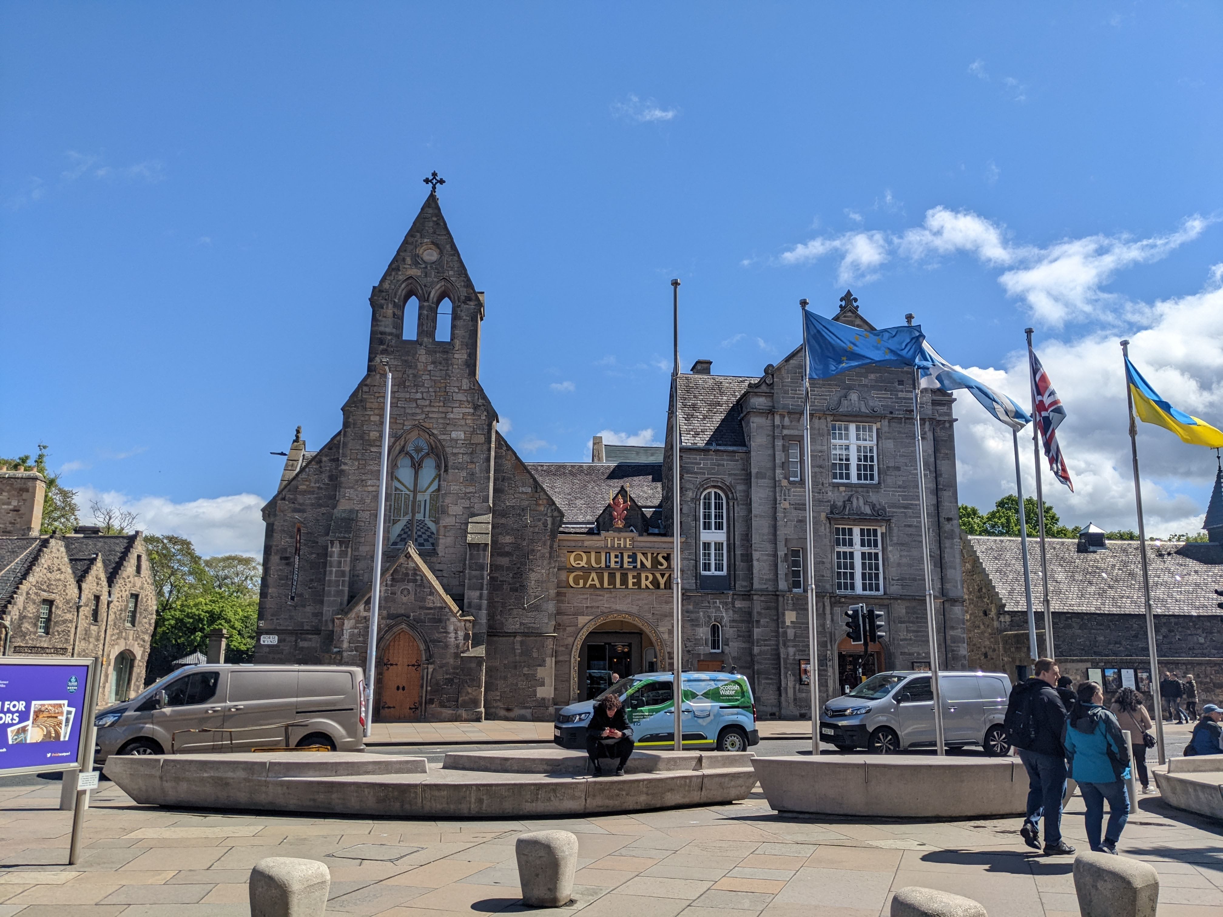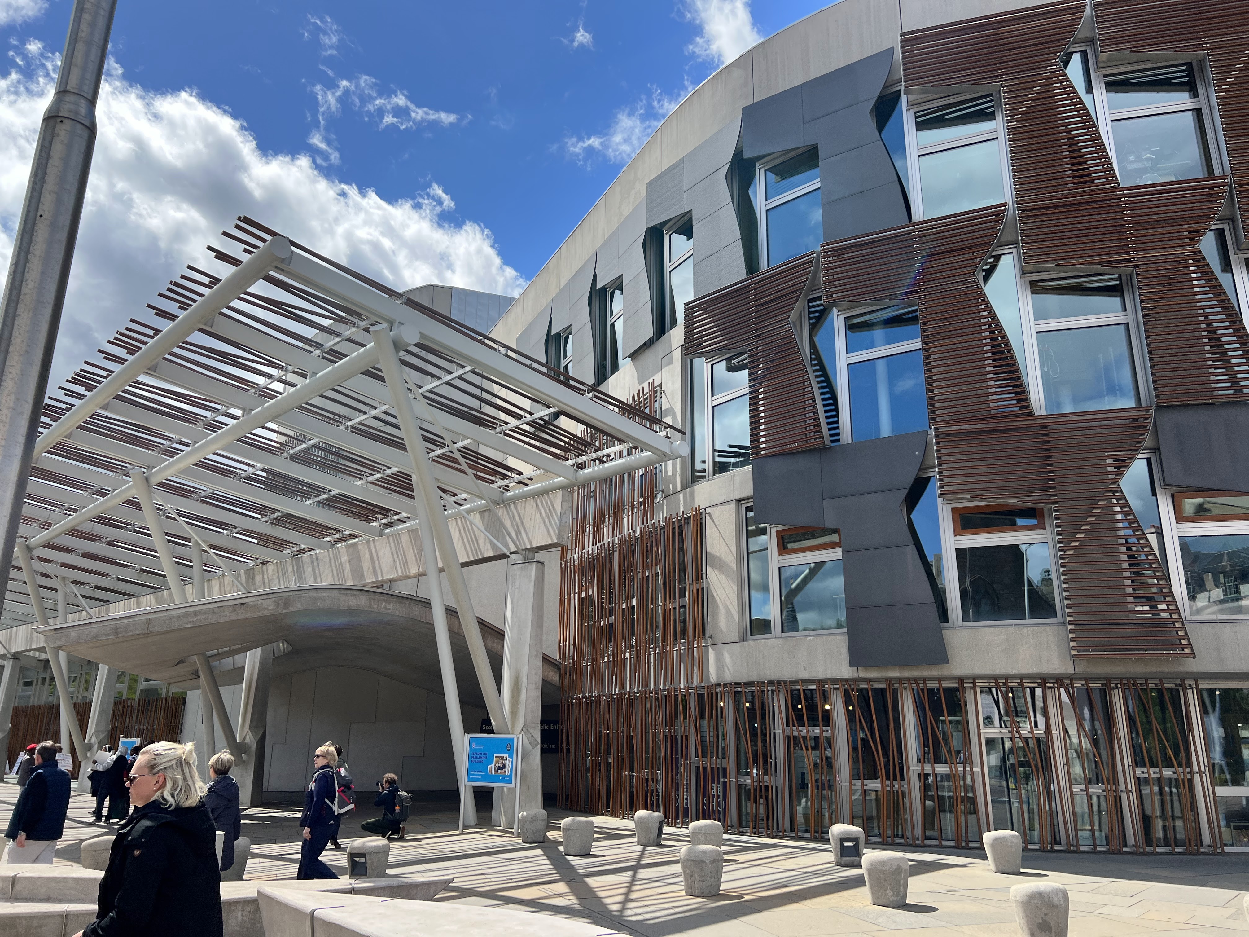 She was able to then meet up with Mark and Susan who had been moseying on down the Royal Mile (and past more cashmere) towards the Scottish Parliament Building, after visiting the Palace of Holyrood. The parliament building, unlike most of Edinburgh’s architecture, is very modern, completed just recently in 2004. You can see more about the history of the parliament here.