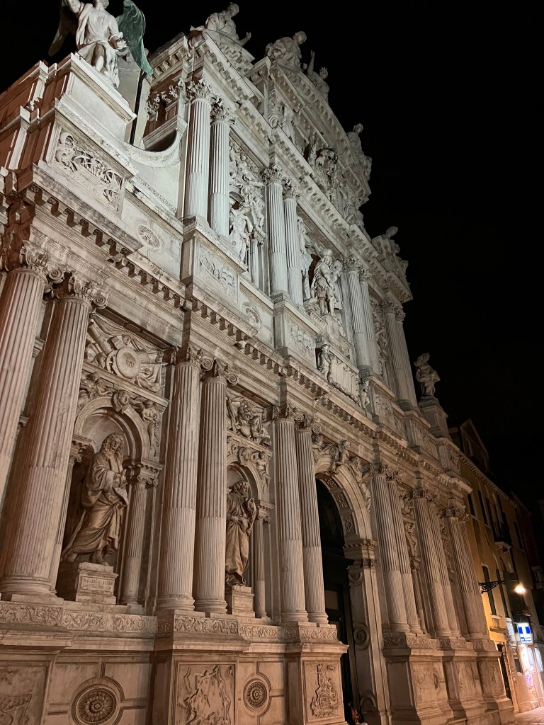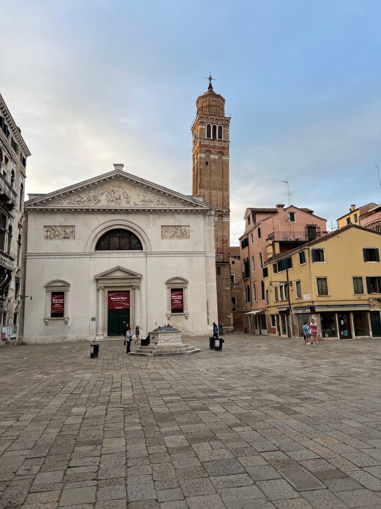 Regarding the above church/museum, we pulled this from Wikipedia: “San Maurizio is a Neoclassical-style, deconsecrated church located in the campo San Maurizio in the sestiere of San Marco of the city of Venice, Italy. It now is a Museum focusing on the music of Baroque Venice. A church was present at the site before the first reconstruction in the 16th century.” We poked our heads in there at one point because we heard there were fabulous stringed instruments on display, and there were – but you had to pay to walk around … OR you could come to a concert that night with musicians playing the very instruments, very beautiful, and concert admission got you walking around privileges. We thought that would be a cool thing to do but a little too … aspirational … to think we’d be able to stay awake the whole concert. Also, the tower is the Campanile di Santo Stefano.