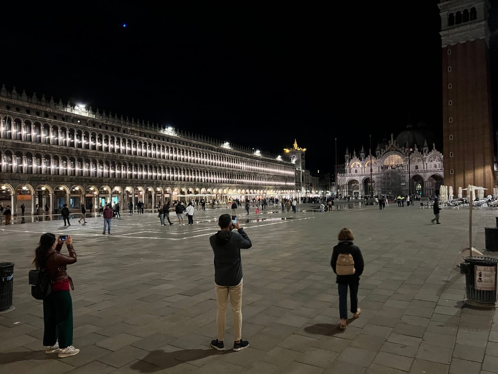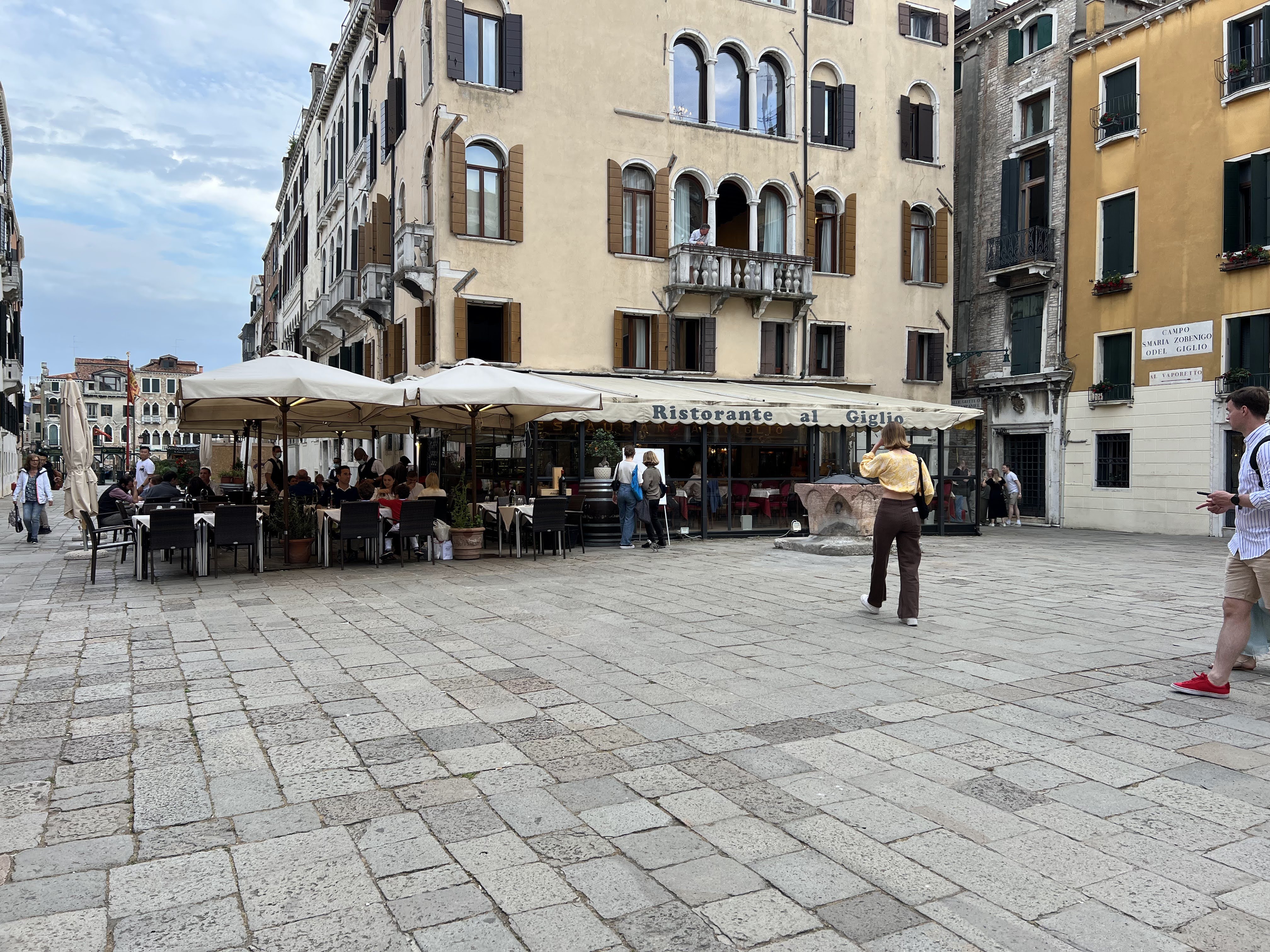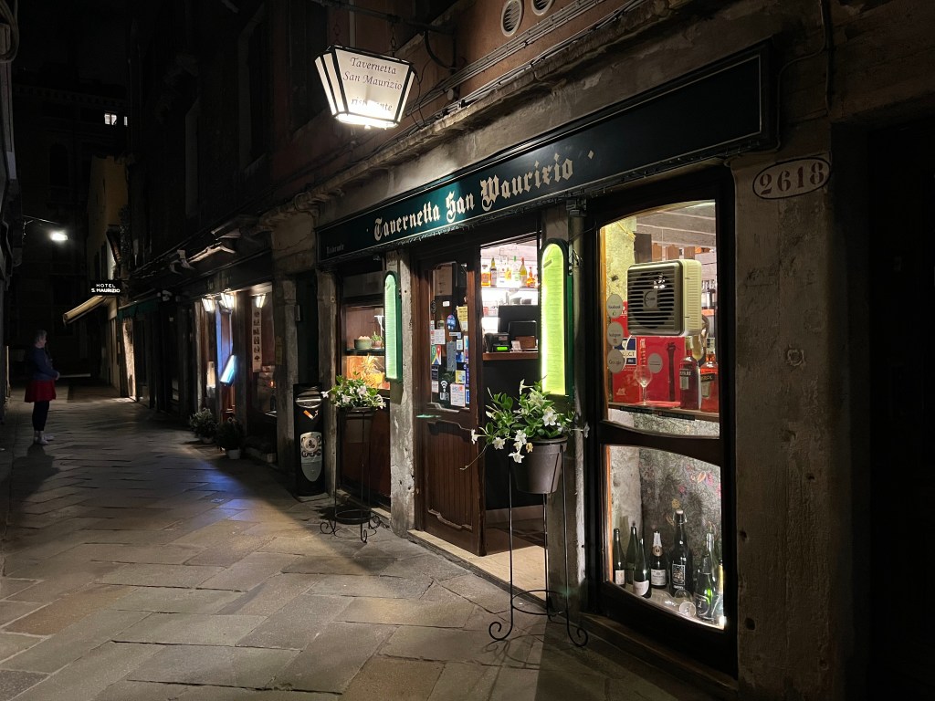 Piazza de San Marco at night. Everyone had their phones out all the time taking pictures. The tower to the right is the campanile (bell tower) and the Basilica de San Marco is right next to it. To the left, the long building with shops is one of the three Procuratie, formerly administrative buildings that are now museum spaces on the upstairs floors. There are at least three restaurants in this part of the piazza with their own bands or orchestras. The piazza is large enough that generally, when you’re close to one band, you don’t hear the others – but in certain spots you can hear several at once. You can also see Chiesa di Santa Maria del Giglio in the top middle photo and Tavernetta San Maurizio – where we had dinner the first night (top right photo). As you’d imagine, it’s just off the Piazza de San Maurizio, which is outside the Église San Maurizio.
