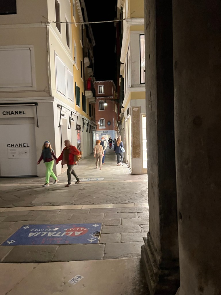 The first night after dinner we realized there was a route, following streets over bridges and through piazzas, between our hotel and the Piazza de San Marco – we must have walked that half a dozen times or more (see top left photo). We basically followed the people and the fancy shops. I’m not normally a window-shopper but that was actually a really fun thing to do here.