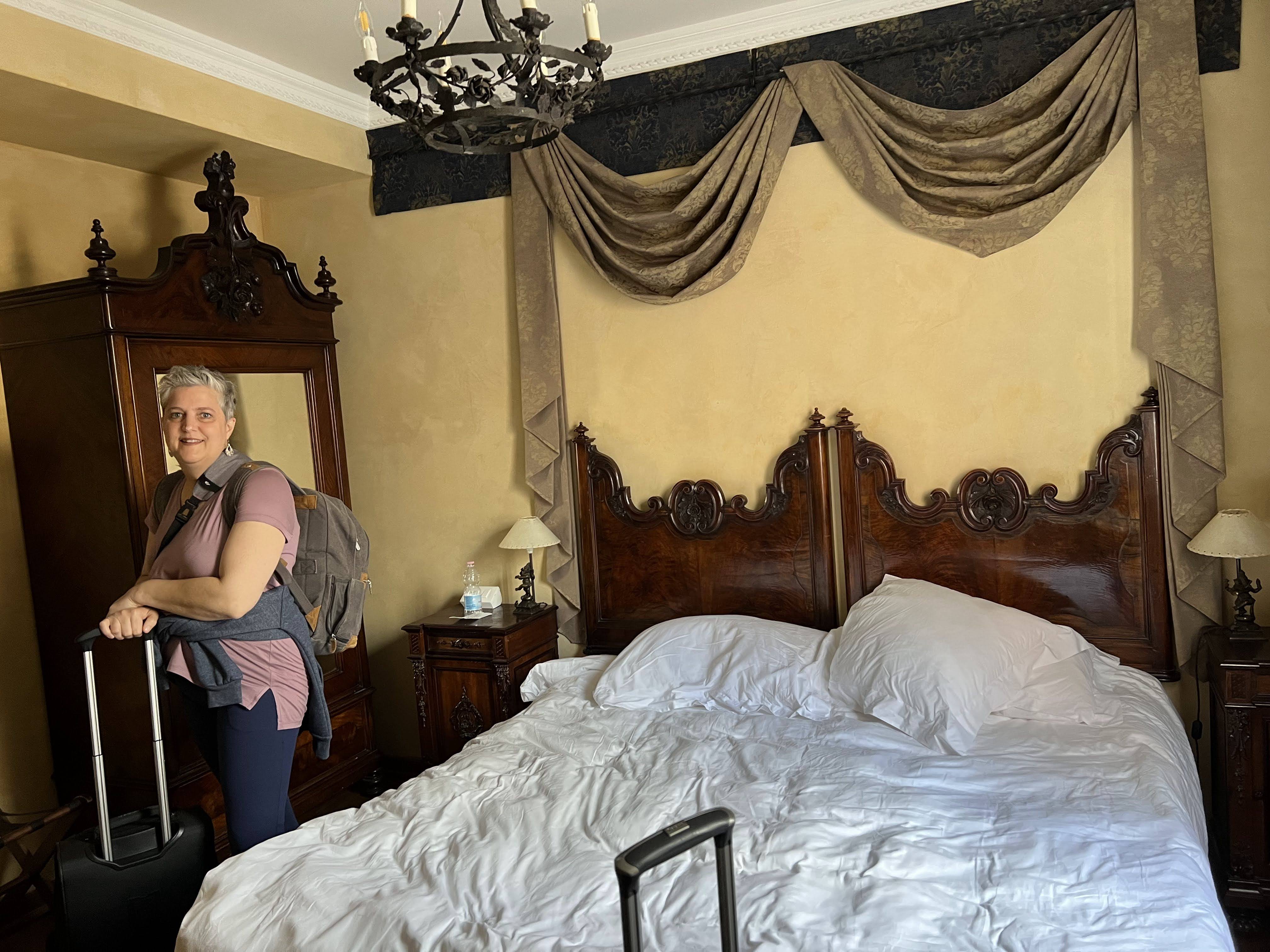 And of course, a blog post on this site wouldn’t be complete without some minutia about how we got from one place to another: here’s Susan in the charming Novecente Hotel room as we’re checking out, and our trusty steed for the drive to Firenze (Florence).