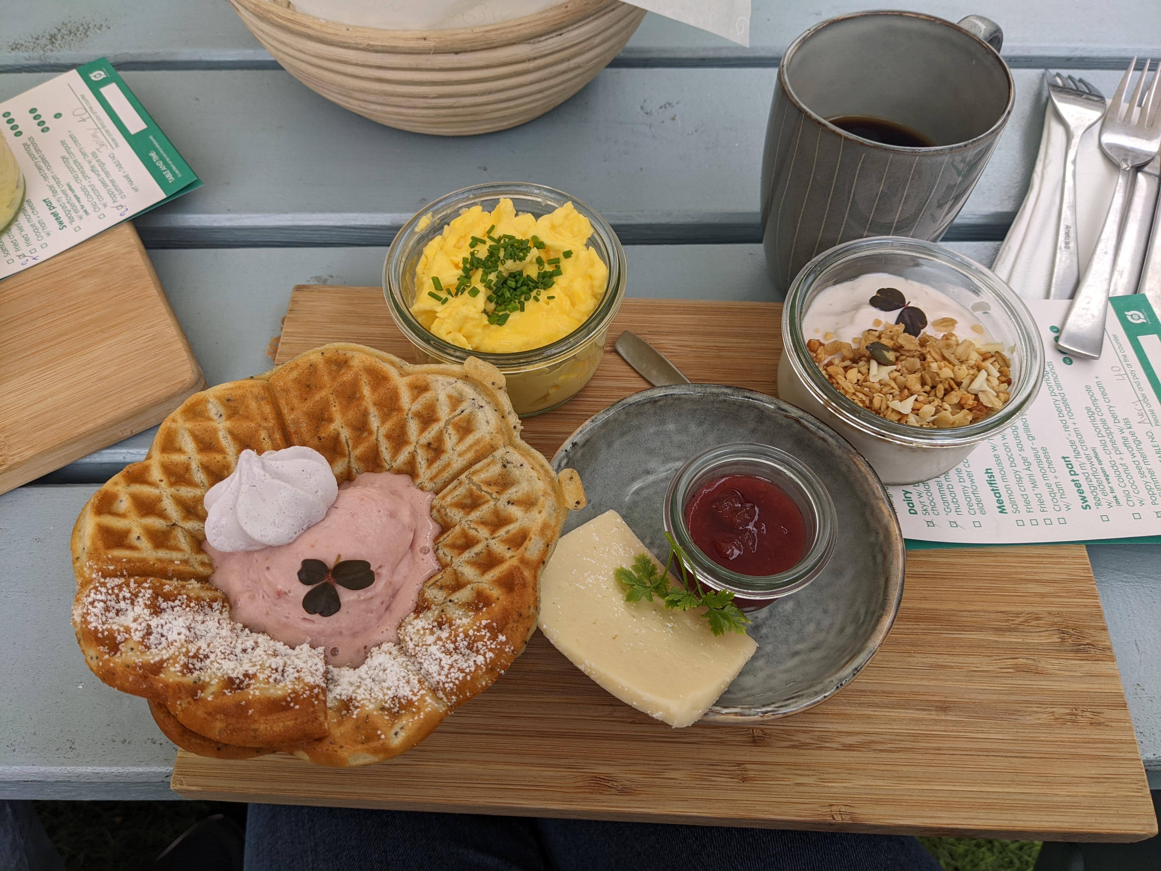 Brunch spread that was heavy on the rhubarb at Wulff and Konstali; you could build your own breakfast with different carbs, proteins, and condiments, but the rhubarb seemed to be a constant.