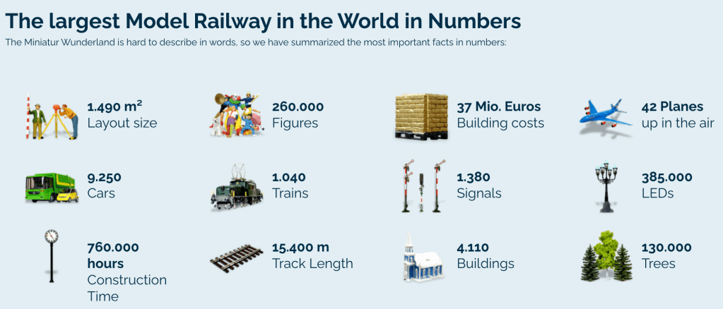 Minatur Wunderland is a model railway and miniature airport attraction, located in the historic Speicherstadt neighborhood of Hamburg. Digging around on the website, I found some stats on the world’s largest model transport system: