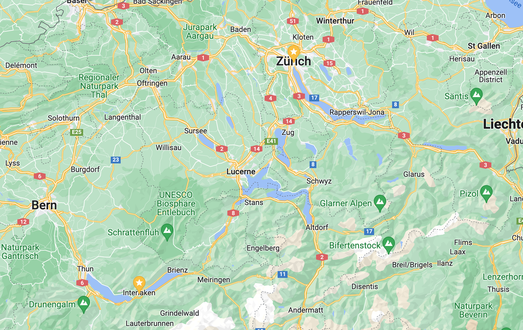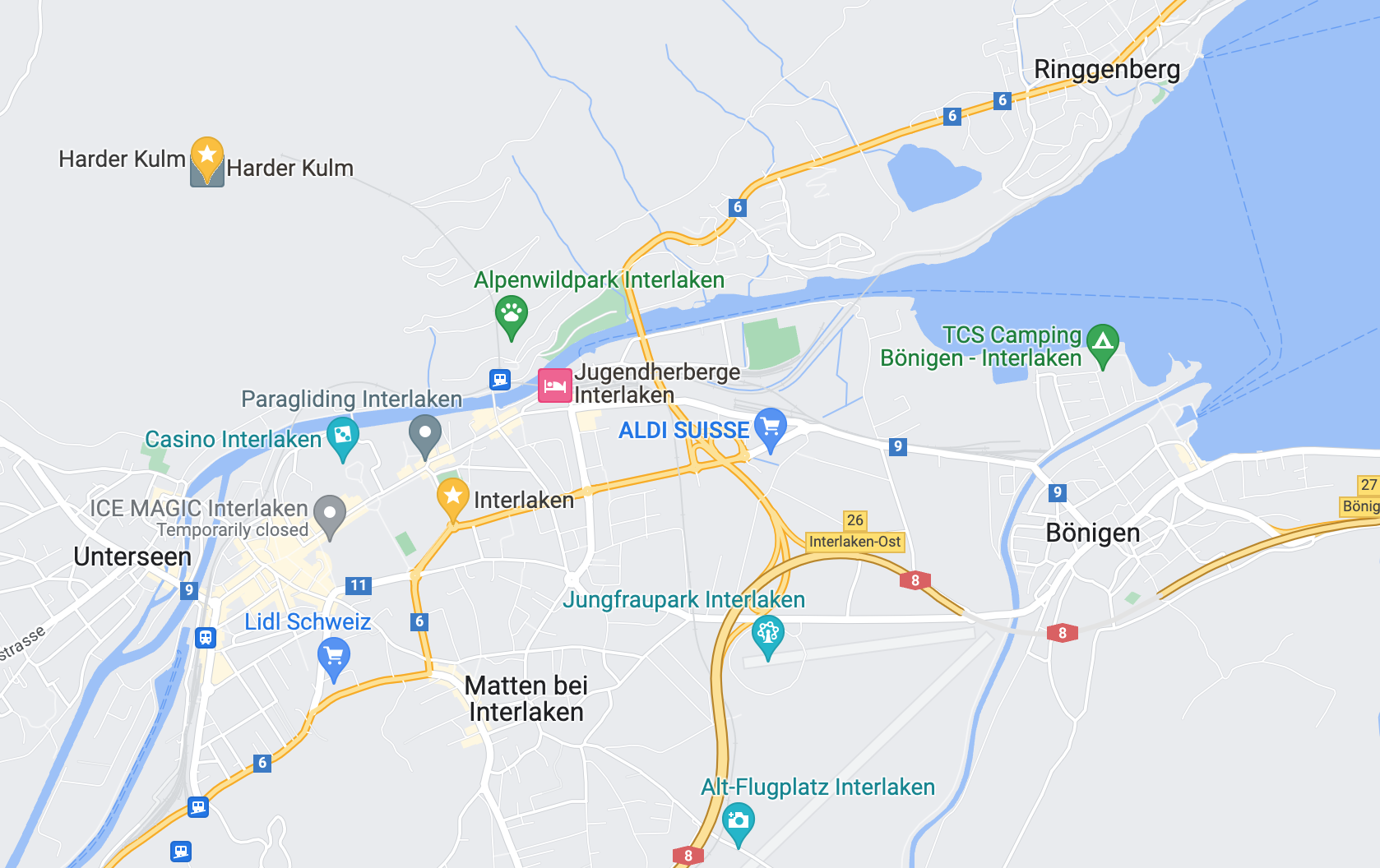 Here, you can see the relative distance between Interlaken and Zurich, as well as the situation of Harder Kulm (see below) next to the town of Interlaken.